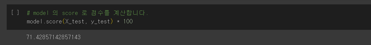 - model.score(X_test, y_test): X_test 특성 데이터와 y_test 레이블 데이터를 사용하여 모델의 점수를 계산합니다. 이는 주어진 테스트 데이터에 대한 모델의 정확도를 나타냅니다.