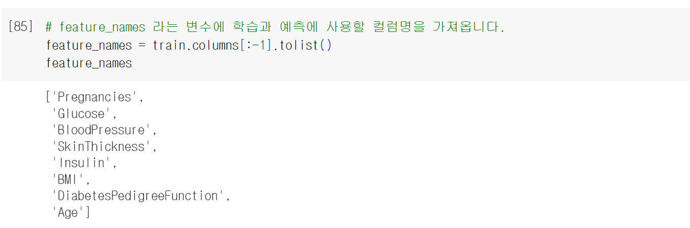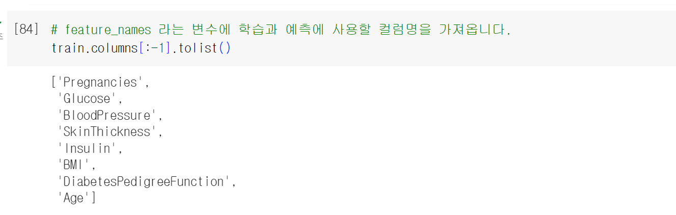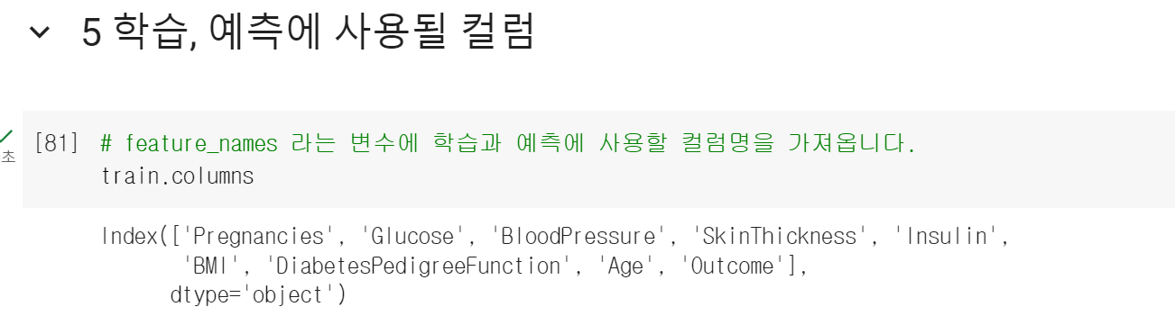 > feature names에는 학습과 예측에 사용될 데이터들을 담아주었다.