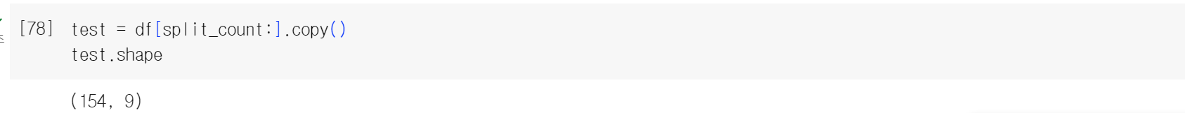 이렇게 만든 데이터셋을 .copy 해주고 test라는 변수에 담은 후 shape을 보았다.