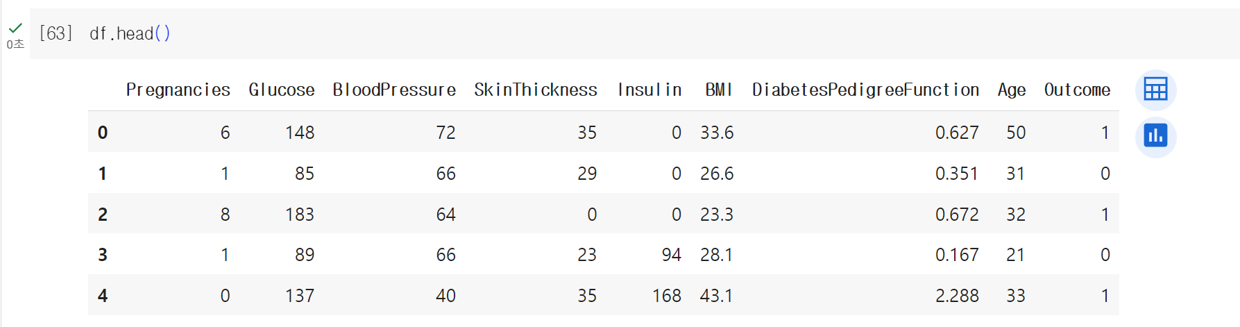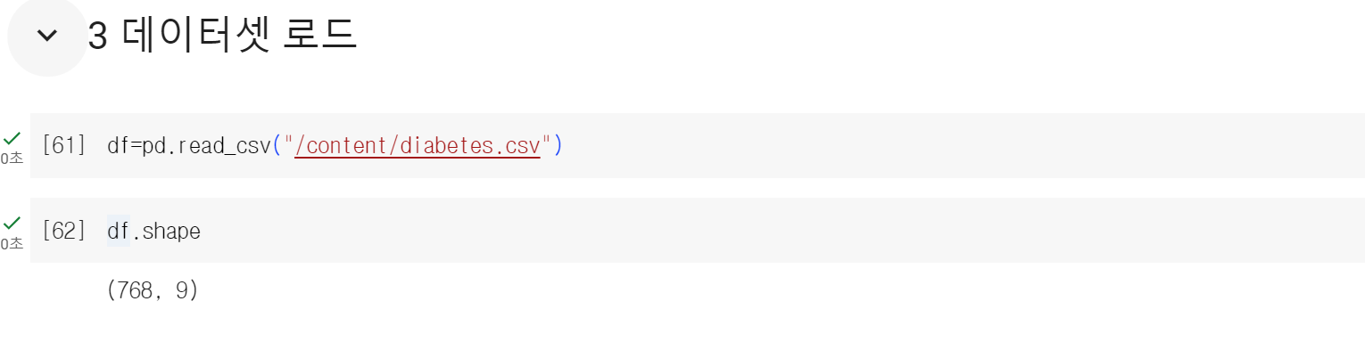 df로 변수 저장 후, shape으로 데이터 개수를 보았다. 768개 행과 9개 열로 되어있는 것을 볼 수 있다.