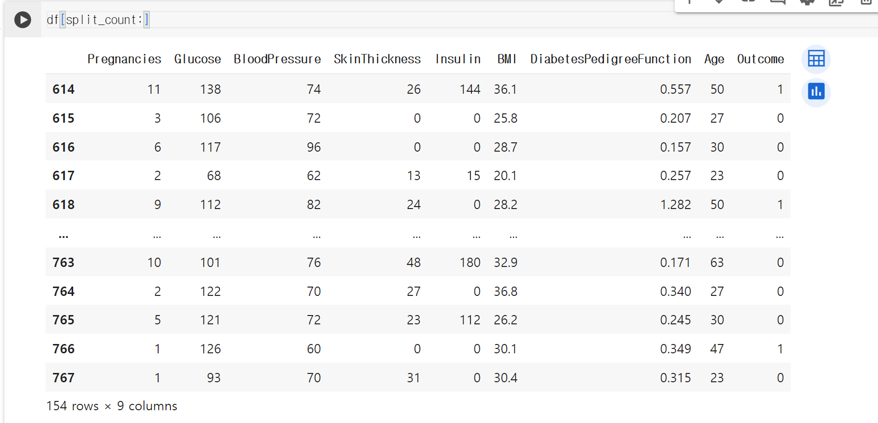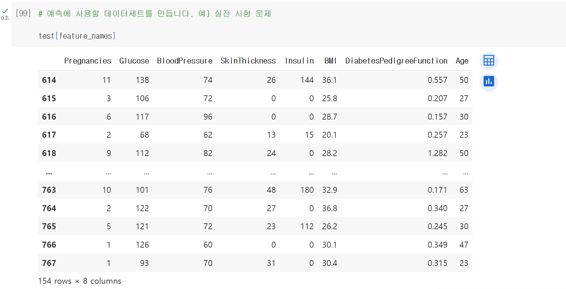 > 154개의 행과 9개의 열로 이루어진 것을 볼 수 있었다. 학습/테스트 데이터셋을 나눠준 과정이었다.