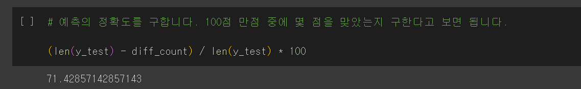 - /(len(y_test)): 전체 테스트 샘플 수로 나누어 정확도를 계산합니다. 이는 올바르게 예측한 샘플의 비율을 나타냅니다.