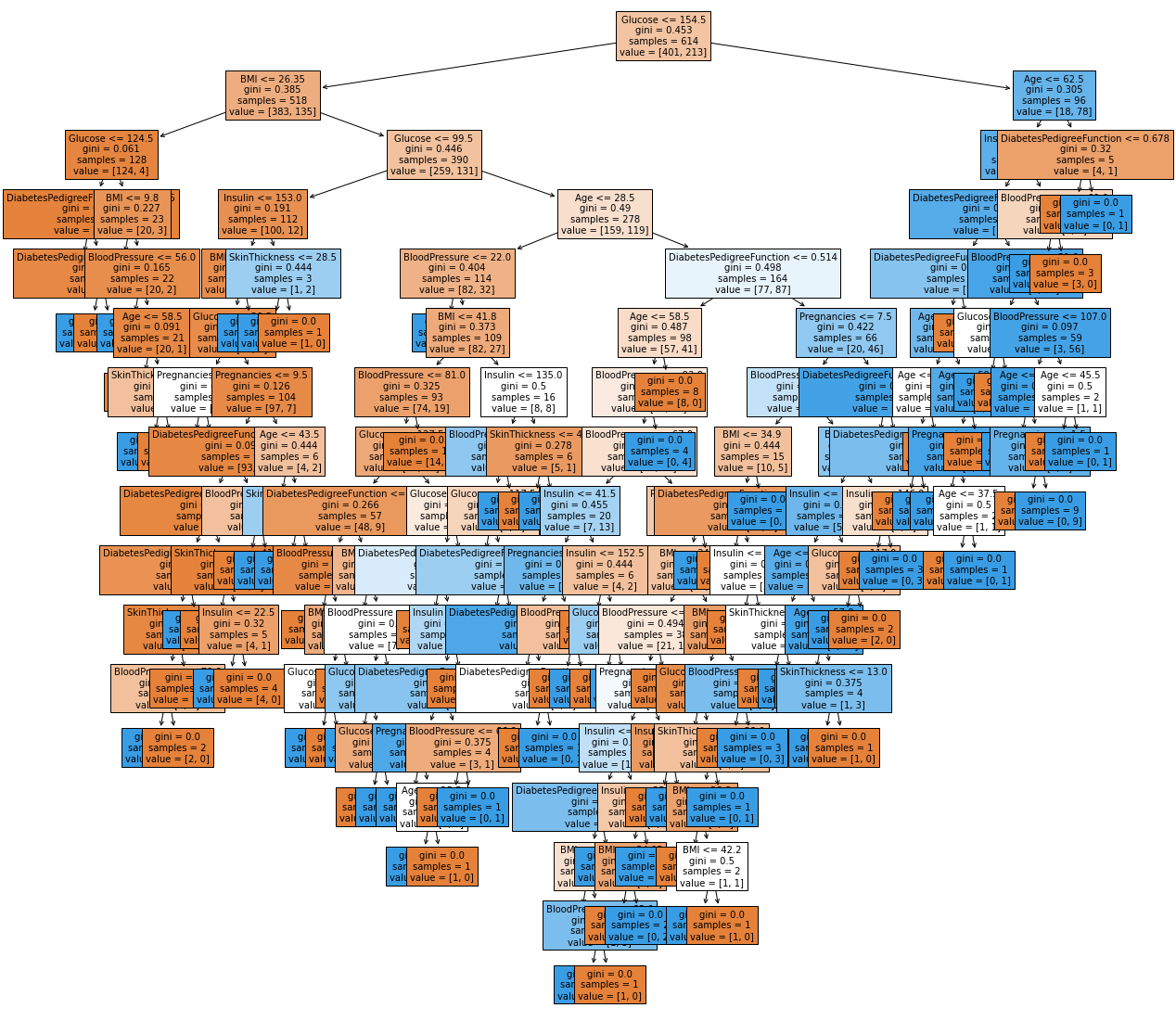 차트의 크기가 작아서 잘 보이지 않는 점을 보완하기 위해 plt.figure(figsize=(20, 20))을 설정하여 Decision Tree의 크기를 키워줍니다. (가로 세로 각각 20인치)