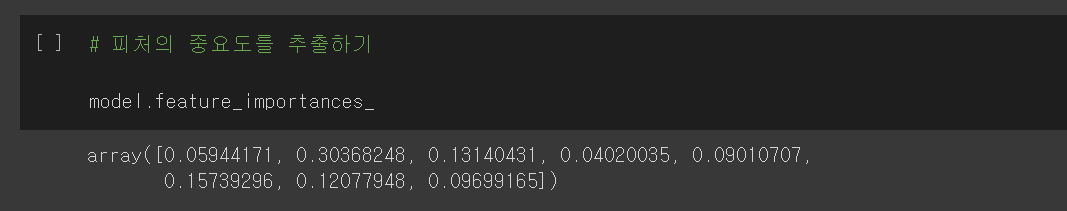 위 코드를 실행하면 각 피처에 대한 중요도가 포함된 배열이 반환됩니다. 이 값은 피처가 모델에 얼마나 기여하는지를 나타내며, 값이 높을수록 해당 피처가 모델의 예측에 중요한 역할을 한다는 것을 의미합니다.
