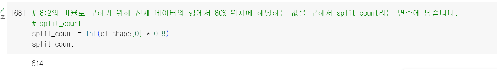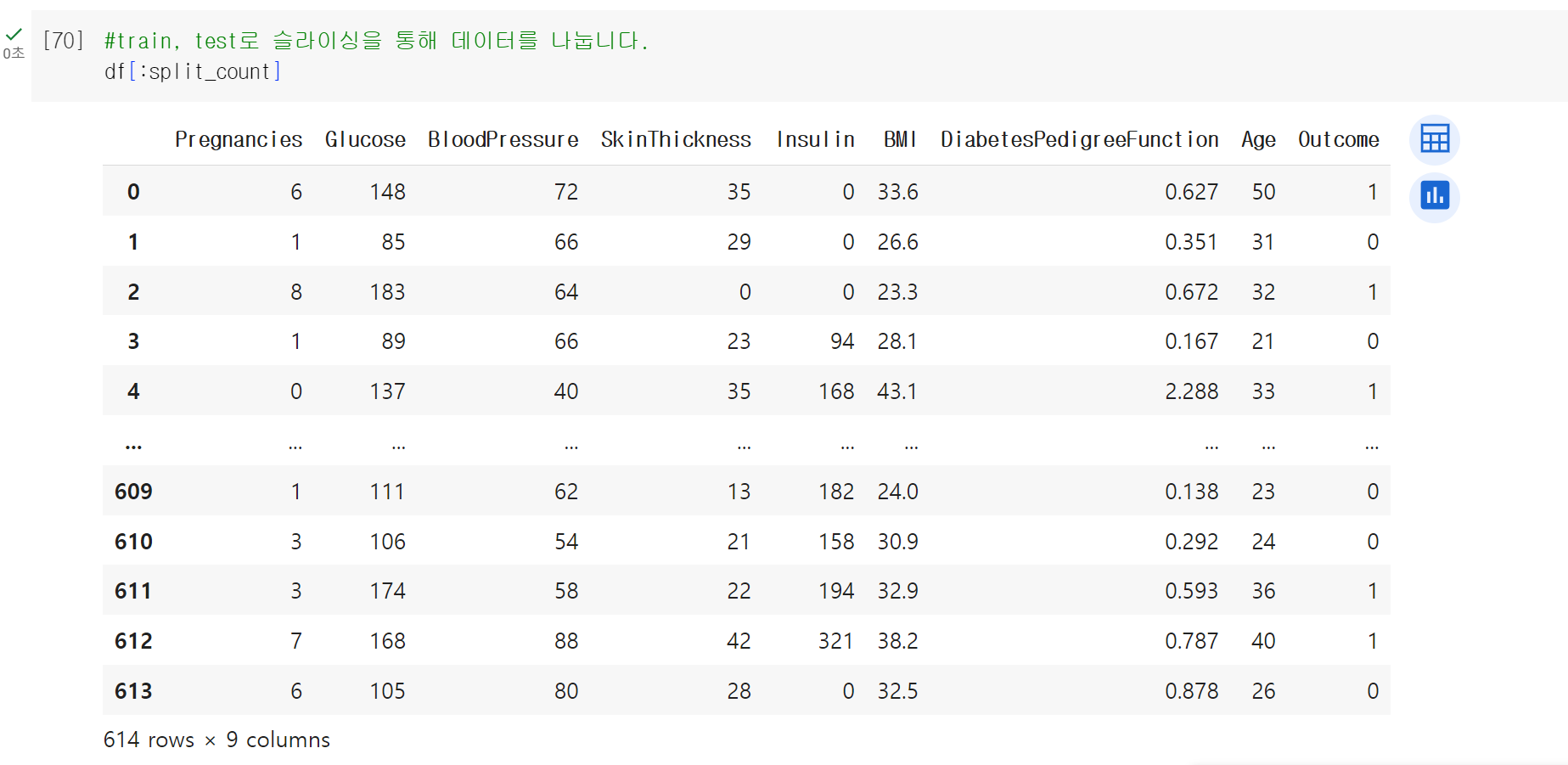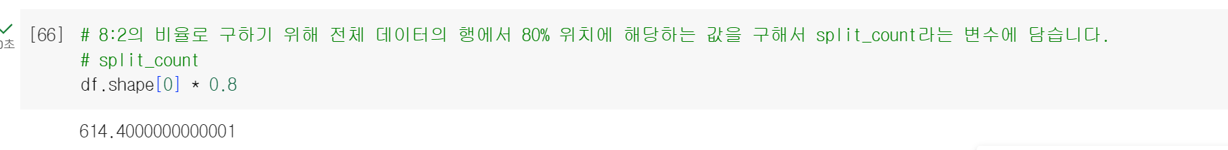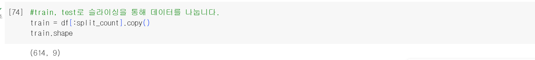 > 이번에는 앞에 split_count를 넣어서 614번부터 767번까지 총 154개의 행을 가지고 왔다. 위에서 데이터 셋을 8:2의 비율로 나눠주기 위해 80퍼센트를 train으로, 나머지 20퍼센트를 test로 만들어주었다.