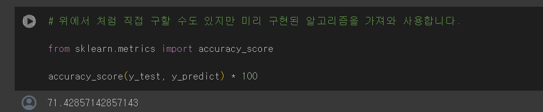 scikit-learn에서 제공하는 accuracy_score 함수를 사용하여 모델의 예측 정확도를 계산하는 방법도 있습니다.