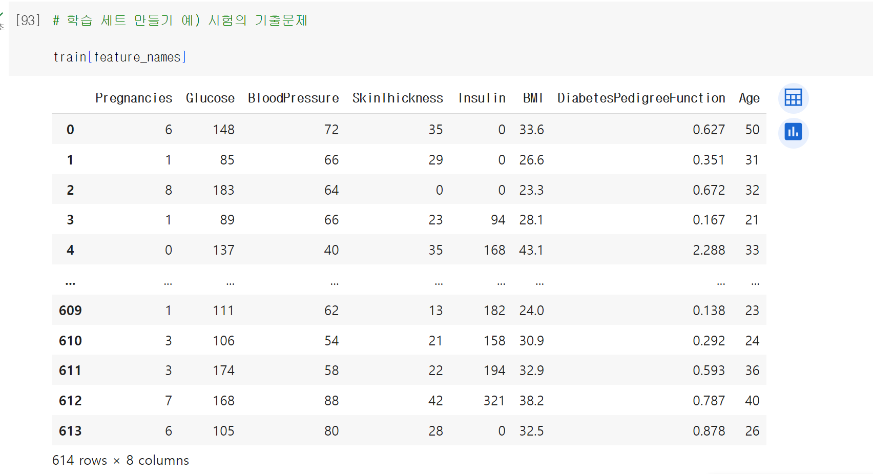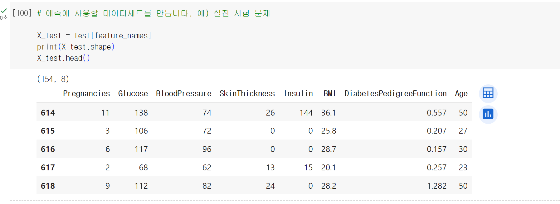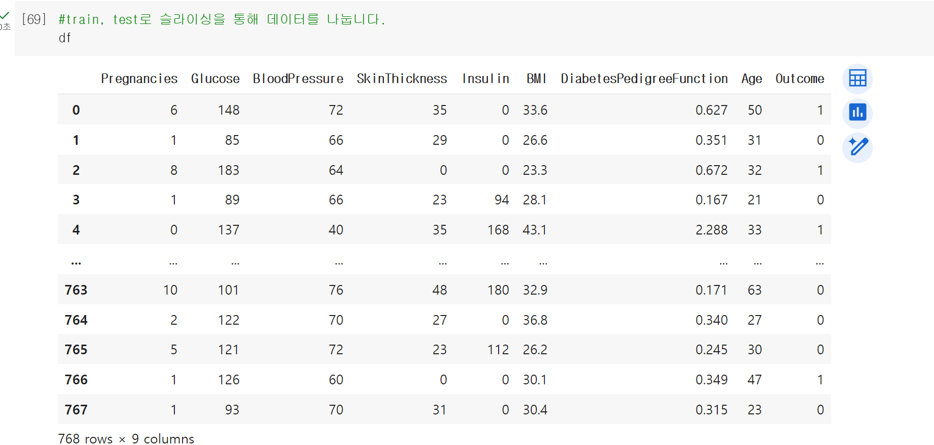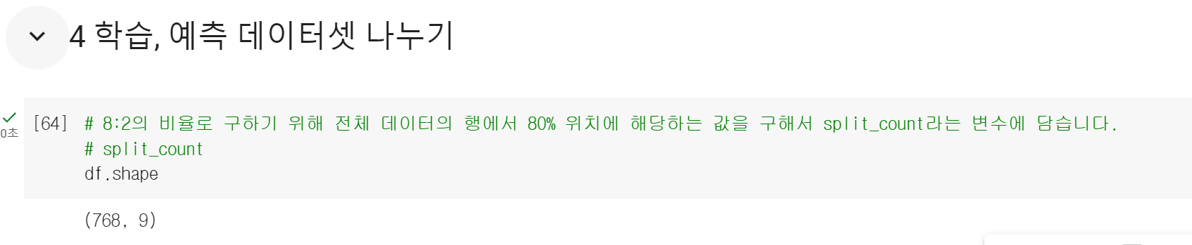> shape을 이용해서 768개의 행을 확인하고, 튜플 형태로 행과 열의 개수를 출력한다.