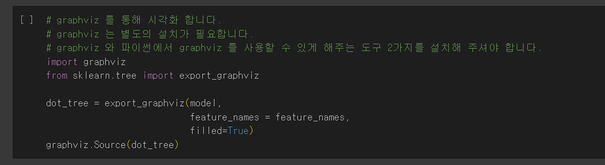 2. from sklearn.tree import export_graphviz: Scikit-learn에서 결정 트리를 graphviz 형식으로 내보내기 위한 함수를 임포트합니다.