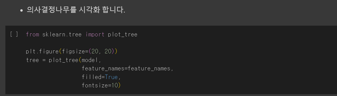 from sklearn.tree import plot_tree는 scikit-learn에서 제공하는 결정 트리 모델을 시각화하기 위한 함수입니다. 이를 사용하면 학습된 결정 트리 모델의 구조를 시각적으로 확인할 수 있습니다.