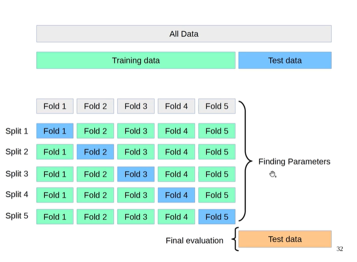 위 과정을 통해 다섯개의 split으로 쪼갠 후, fold들의 평균 점수를 계산해서 점수가 가장 높은 모델을 찾아낸다.