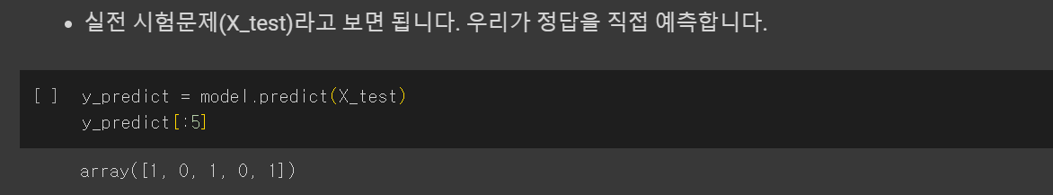 'y_predict[:5]'는 'y_predict'의 처음 5개의 요소를 출력하여 모델의 예측값을 간단히 미리 보는 과정입니다.