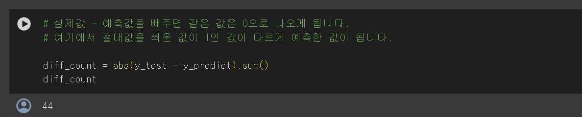 하지만 오류가 있다면 '| (y_test - y_predict) | = 1'이라는 결과가 출력됩니다. sum() 함수를 사용하여 이 값들의 합을 구했을 때 나오는 숫자 44는 모델이 예측한 값에서 44개의 오류가 있다는 뜻입니다.