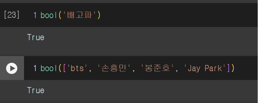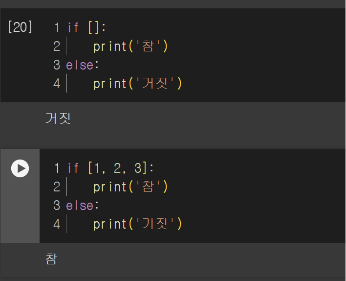 ์์ ์์์๋ ์ ์ ์๋ฏ์ด, []๋ ๋น์ด์๋ ๋ฆฌ์คํธ ์ด๋ฏ๋ก ‘๊ฑฐ์ง’์ด, [1, 2, 3]์ ์์๊ฐ์ด ์๋ ๋ฆฌ์คํธ ์ด๋ฏ๋ก ‘์ฐธ’์ด๋ค