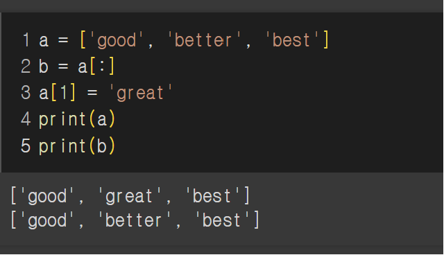 ์ฒซ ๋ฒ์งธ ๋ฐฉ๋ฒ์ ๋ฆฌ์คํธ ์ ์ฒด๋ฅผ ๊ฐ๋ฆฌํค๋ [:]๋ฅผ ์ฌ์ฉํด์ ๋ณต์ฌํ๋ ๊ฒ์ด๋ค