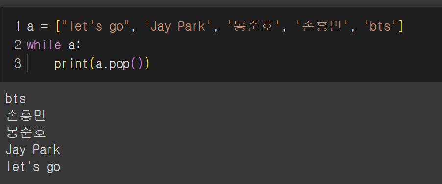 ์ ์๋ฅผ ๋ณด๋ฉด, a๊ฐ ์ฐธ์ธ ๊ฒฝ์ฐ, a.pop()๋ฅผ ๊ณ์ ์คํํ์ฌ ์ถ๋ ฅํ๋ผ๋ ์๋ฏธ์ด๋ค
