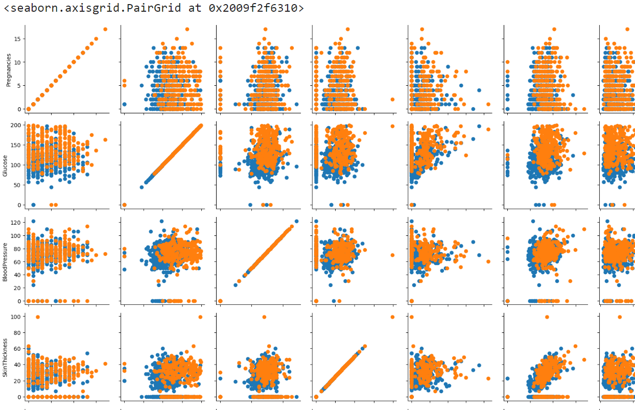 다음에서 두 개의 변수를 정답값(Outcome)에 따라 여러가지 플롯으로 시각화 해보자.