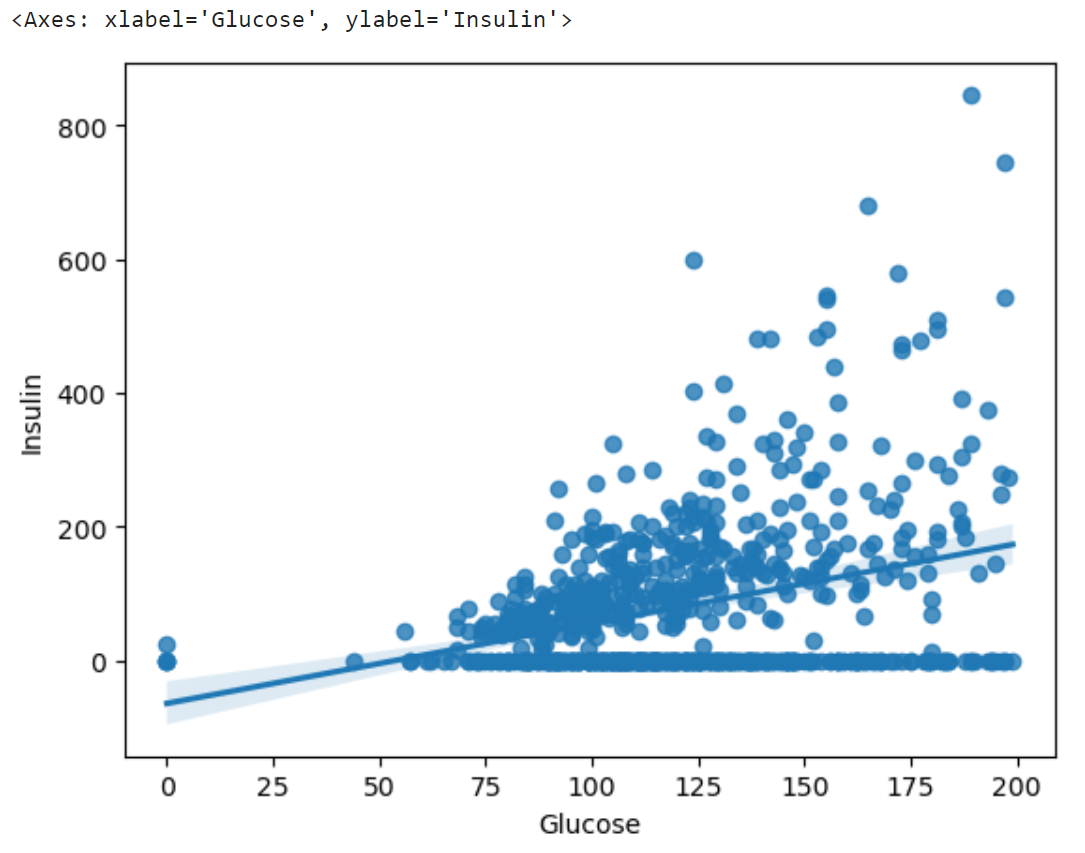 위의 heatmap에서 상관계수가 높았던 Insulin과 Glucose 수치로 regplot을 그려보았다.