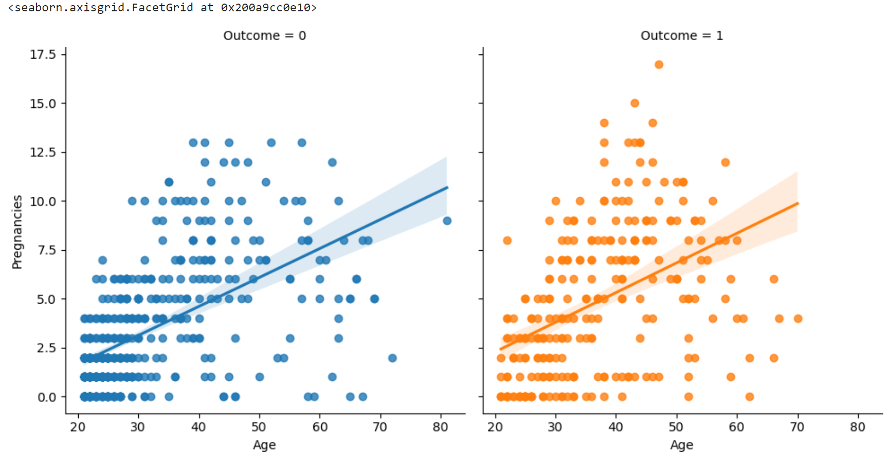 이번에는 Age 와 Pregnancies를 lmplot으로 그리고 hue를 통해 Outcome을 다른 색상으로 표시해보았다.