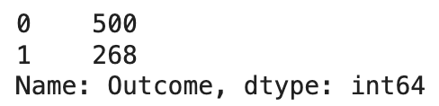 df["Outcome"] -> 모든 행의 Outcome의 값을 나타낸다. ".value_counts()"을 뒤에 붙여 데이터프레임의 outcome의 갯수를 세서 보여준다. 여기서 0은 발병하지 않는, No의 값이고, 1은 발병하는 케이스로 Yes의 의미를 나타낸다.