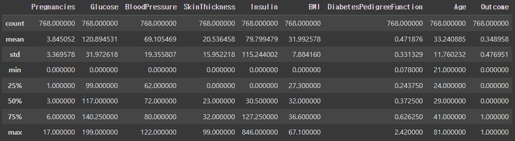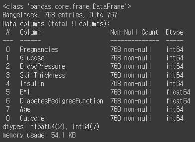 info()를 이용해 데이터 타입, 결측치, 메모리 사용량 등의 정보를 확인한다. BMI와 DiabetesPedigreeFunction은 float의 데이터 타입을 가지며, 이 둘을 제외한 나머지 데이터들은 int의 데이터 타입을 가진다.
