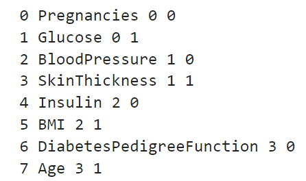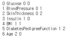 우선 Pregnancies_high 와 Outcome 열을 제외한 dataframe에서 0을 결측치로 바꾸는 작업을 수행하였다. 그 후 Outcome 열을 추가한 df_matrix 를 만들어주었다.