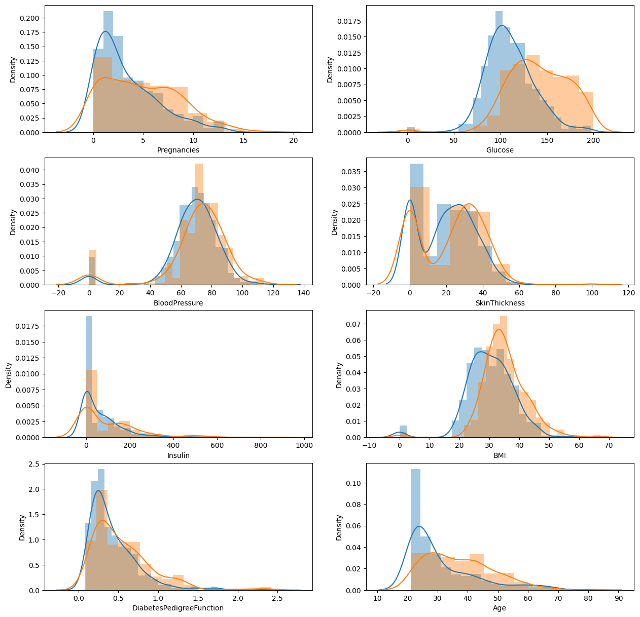 ● 반목문을 통해 Outcome 의 여부에 따라 distplot을 그려보기