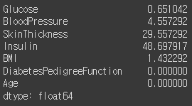 Pregnancies를 제외한 모든 데이터들은 0값이 결측치라고 볼 수 있기 때문에 feature_columns 중에서 첫번째 열을 빼고, 나머지 수치들을 cols 변수로 지정해 준다.