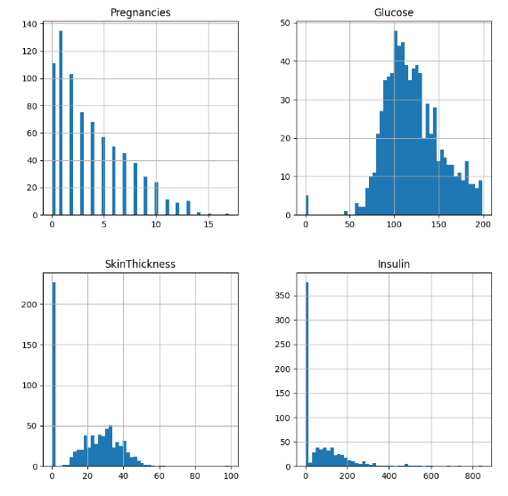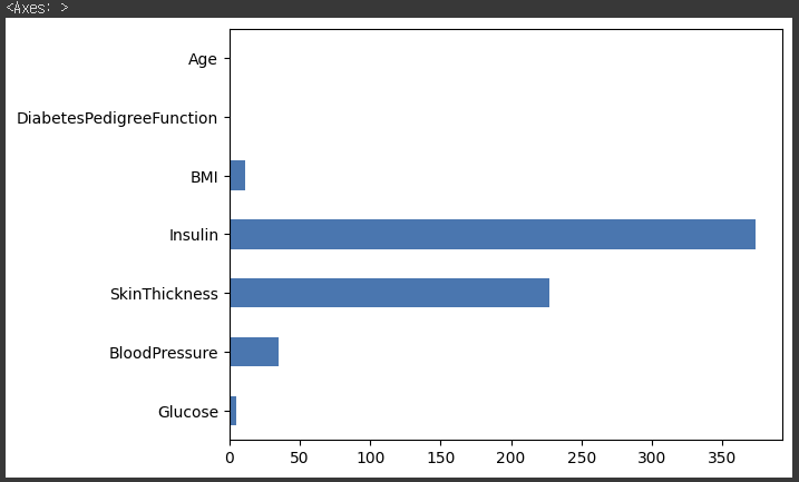 값을 요약했을 때 최솟값이 0이 나오는 데이터 들이 있는데, 인슐리이나 혈압 등의 값은 0이 나올 수가 없기 때문에 이러한 값들은 결측치라고 볼 수 있다. 따라서, 0인 값을 결측치로 처리하고 시각화 해 볼 것이다.