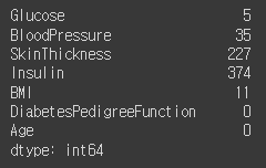 위에서 보다시피 Insulin 같은 변수의 경우 0, 즉 결측치로 간주해야 할 값이 많으므로 상관계수가 작은 모습이다. 따라서 0을 결측치로 만들어주는 작업을 수행해야 한다.