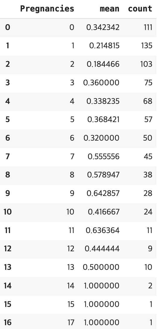 df_po = df.groupby(["Pregnancies"])["Outcome"].agg(["mean", "count"]).reset_index()