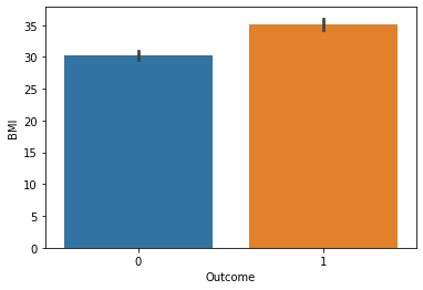 sns.barplot(data=df, x="Outcome", y="BMI")