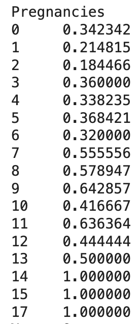 groupby 함수는 판다스 내부 함수로 별도의 데이터를 처리하기 위해 사용하는 함수이다. 여기서는 임신 횟수와 당뇨병 발병 여부의 관계를 보기 위해 지정했다. ".mean()"을 덧붙여 임신 횟수 별 발병 확률을 나타낸다.