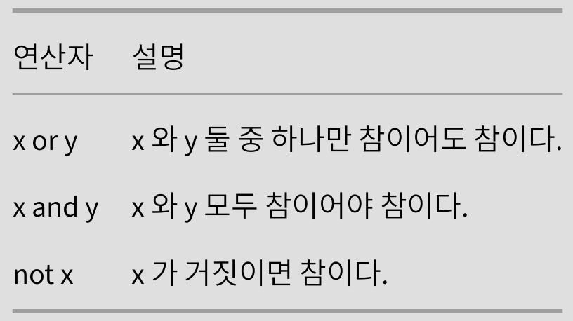 ์ฐธ๊ณผ ๊ฑฐ์ง์ ๋ํ๋ด๋ ์๋ฃํ. True์ False ๋จ ๋ ๊ฐ์ง์ ๊ฐ๋ง ๊ฐ์ง๋ค.