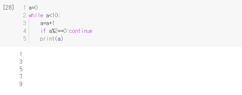 a๊ฐ 10๋ณด๋ค ์์ ๋๋ง๋ค a๋ 1์ฉ ์ฆ๊ฐํ๊ณ , ๊ทธ ์ซ์๊ฐ 2๋ก ๋๋์ด ๋จ์ด์ง๋ฉด continue๋ฌธ์ ํธ์ถํ๊ณ ๋ค์ ์ฒ์์ผ๋ก ๋์๊ฐ๊ณ ์ฒ์ ๋์ ํ๋ a๋ฅผ ์ถ๋ ฅํ๋ค.