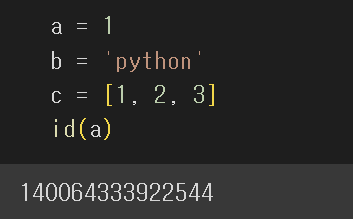 id๋ ๋ณ์๊ฐ ๊ฐ๋ฆฌํค๋ ๊ฐ์ฒด์ ์ฃผ์ ๊ฐ์ ๋ฆฌํดํ๋ ํจ์์ด๋ค. ์ ์ฝ๋์์ ๋ณ์ a์ ์ฃผ์ ๊ฐ์ ๋ฆฌํด๊ฐ 140064333922544.