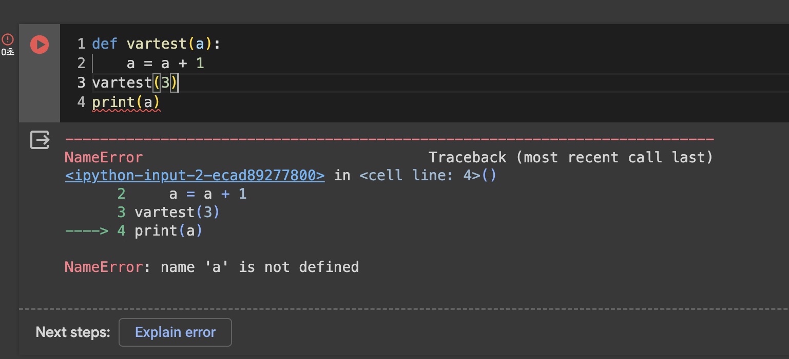 위 내용과 동일하게 함수 내부가 아닌, print(a)에서 사용한 a변수는 어디에서도 선언되지 않았기 때문에 위 함수를 실행하면 오류가 발생한다.