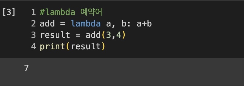위와 같이 lambda 를 이용하면 함수를 한 줄로 간결하게 정리할 수 있다.