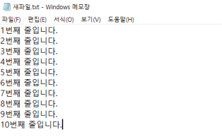 예제이다. 위 프로그램을 실행했을 때 새파일.txt 파일의 가장 첫 번째 줄이 화면에 출력될 것이다.
