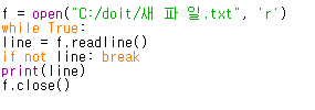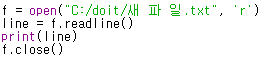 위는 ‘새파일.txt’ 파일을 읽기 모드로 연 후 readline() 을 사용해서 파일의 첫 번째 줄을 읽어 출력하는