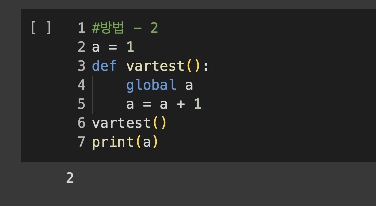 하지만 프로그래밍을 할 땐 함수가 독립적으로 존재하는 것이 좋기 때문에 global 명령어를 사용하지 않는 것이 좋다.