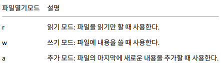 ‘파일 이름’ 과 ‘파일 열기 모드’ 를 입력값으로 받고 결괏값으로 파일 객체를 리턴한다.