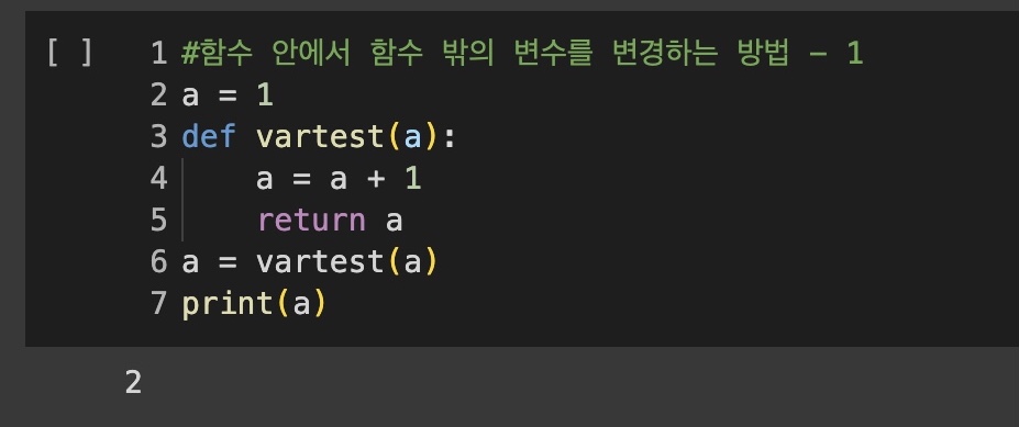첫번째 방법은 return를 사용하는 것이다. vartest 함수는 입력으로 들어온 값에 1을 더한 값을 리턴하도록 변경했다.