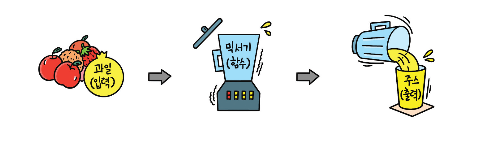 과일이라는 입력을 주스라는 출력으로 바꿔주는 역할을 하는 믹서기가 함수라고 생각할 수 있다.