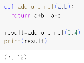 리턴값을 2개로 적어도 결과는 튜플값으로 result는 하나의 값만 출력한다.