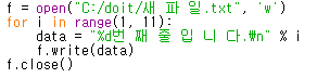 모니터 화면에 데이터를 출력하는 방법이다. 차이점은 print 함수 대신 파일 객체 f 의 write 함수를 사용한 것 말고는 없다