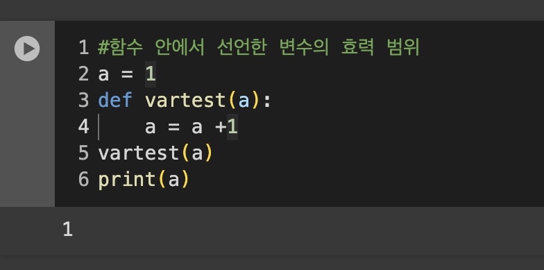 def vartest(a) 에서 입력값을 전달받는 매개변수 a는 함수 안에서만 사용할 뿐, 함수 밖의 변수 a와는 상관없다.