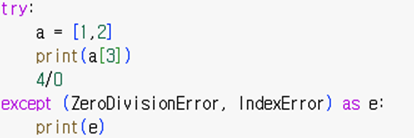 try 블록 수행 중 오류가 발생하면 except 블록이 수행된다.