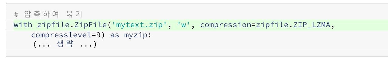 - ZIP_DEFLATED: 일반적인 zip 압축으로 속도가 빠르고 압축률은 낮다. 호환성이 좋음.