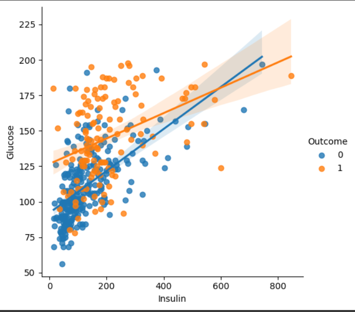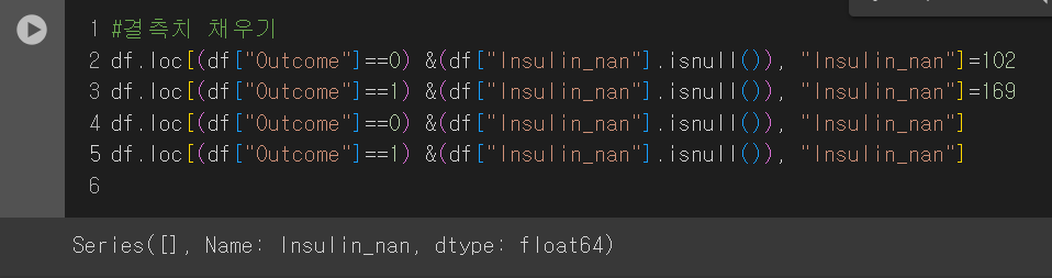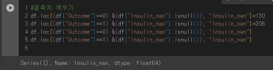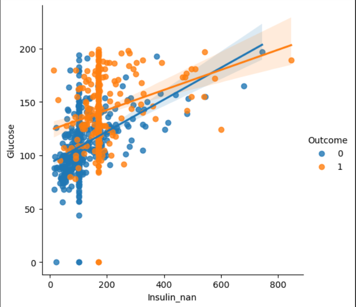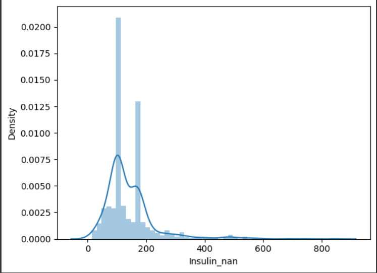 이때 결측치를 처리 안한 인슐린 값은 0에 붙어서 그림이 그려지므로 결측치 처리한 값을 보겠다.