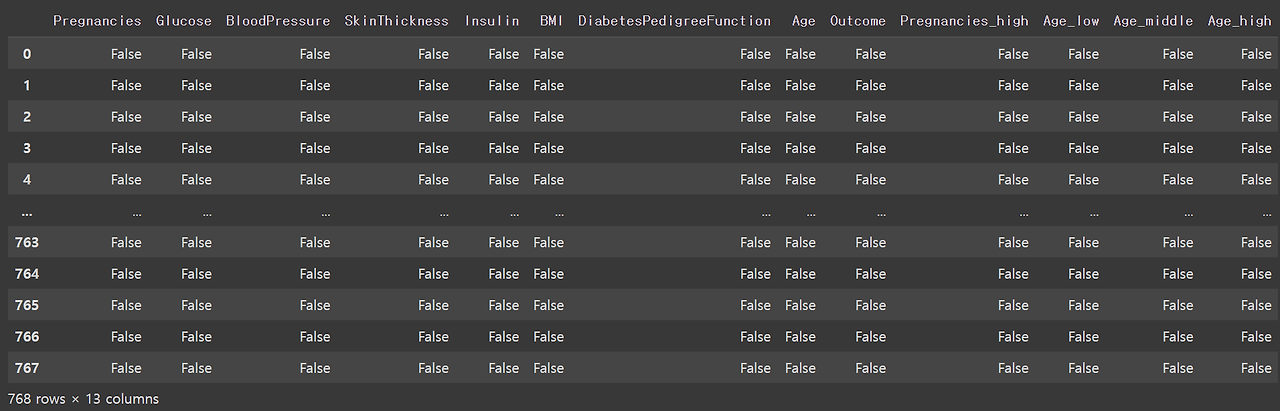 이렇게 나이라는 수치형 변수를 각각 하나의 컬럼에 저장하며 각 항목에 해당하는 샘플은 True 값, 해당하지 않는 샘플엔 False 값을 입력해주었습니다.